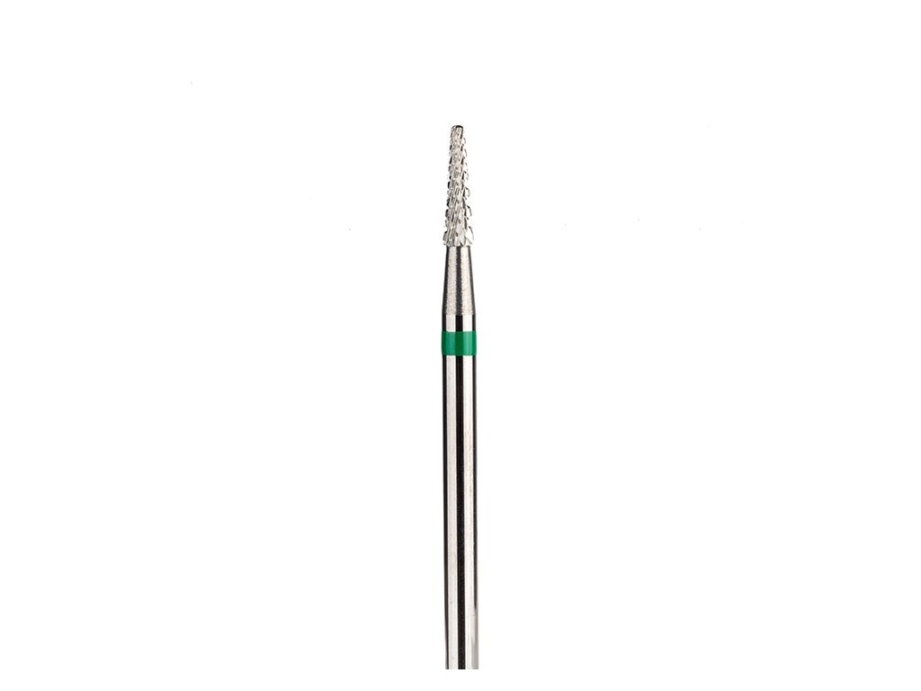 Menší karbidový zelený kužel na pilování zateklého gelu u kůžiček a na podbrušování volného okraje nehtu zespoda. Délka pracovní častí 8 mm. průměr pracovní častí 1,8 mm. Průměr stopky 2,3 mm